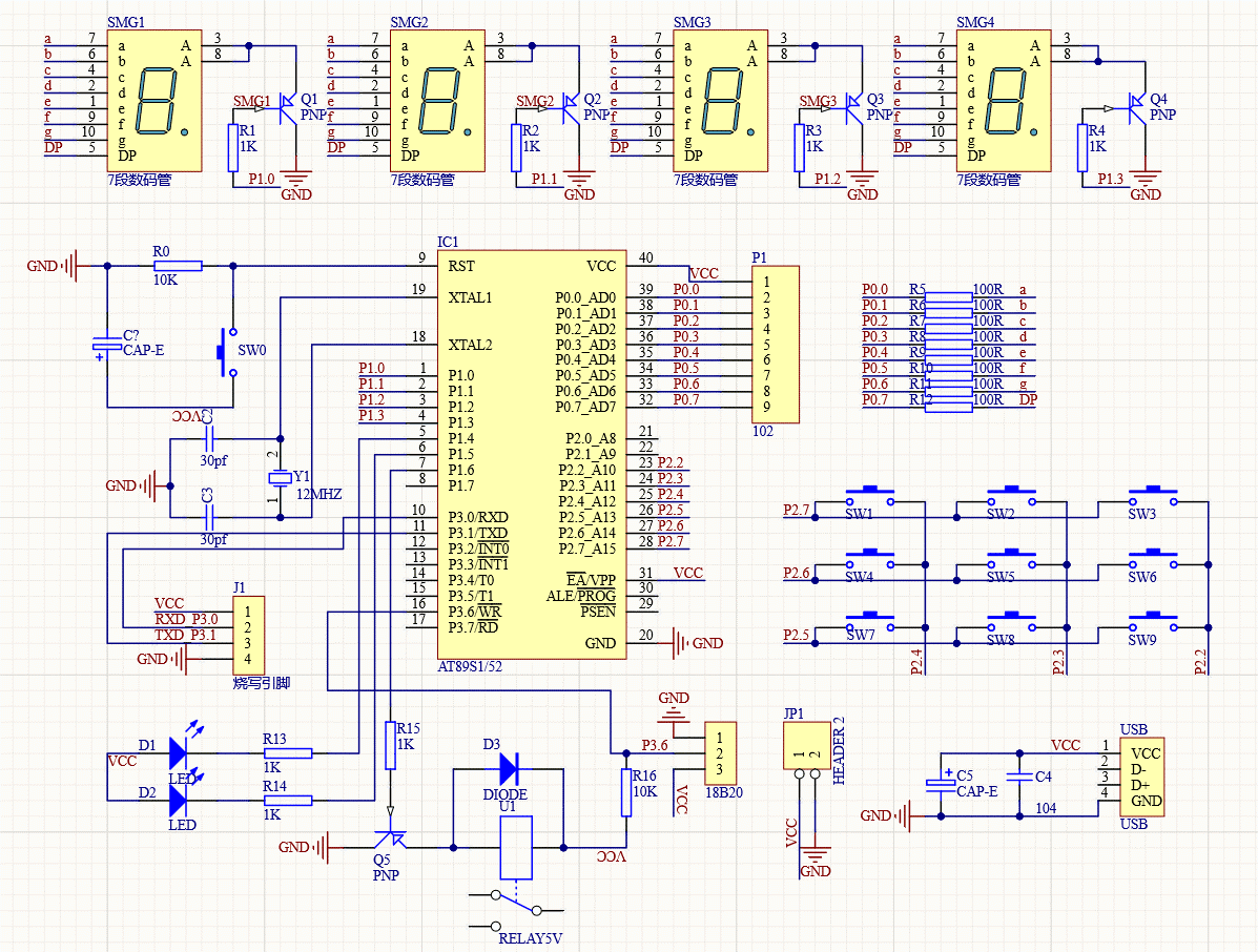 系统框图主要由主控制器、单片机复位、按键设置、时钟振荡、数码管显示、温度传感器组成。8051单片机主要由以下几部分组成: